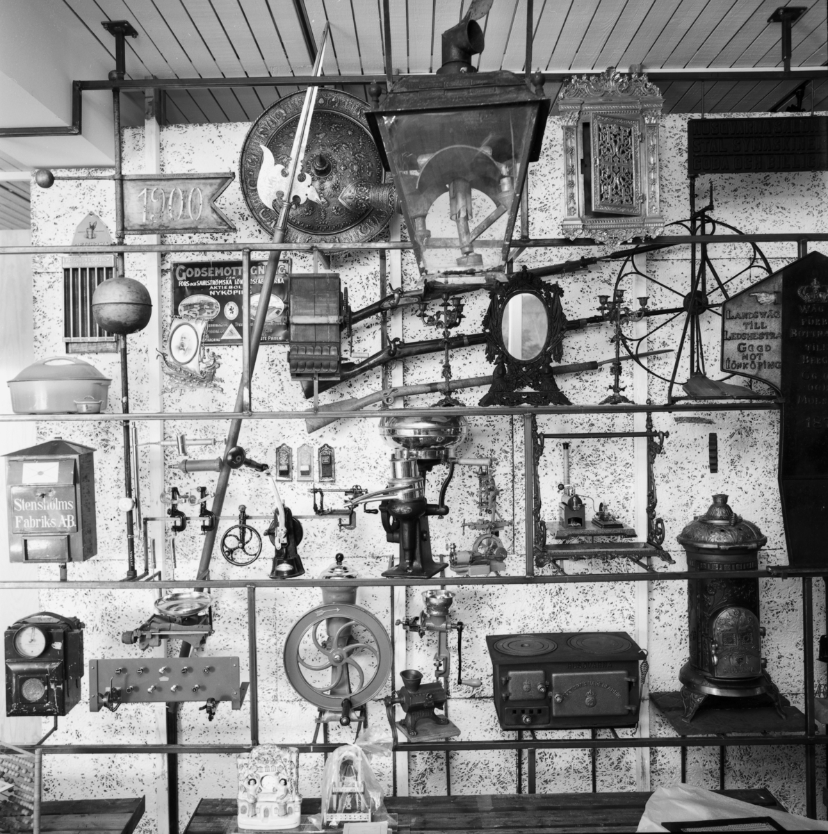 Utställning Tiotusen år. Utställningsdelen Järnväggen. Milstolpe med text 1/4 Mil mo härad 1871 med Carl xv:s namnchiffer. Gatuskylt från Björngränd i Jönköping. Trädgårdsurna tillverkad av Huqvarna AB.
