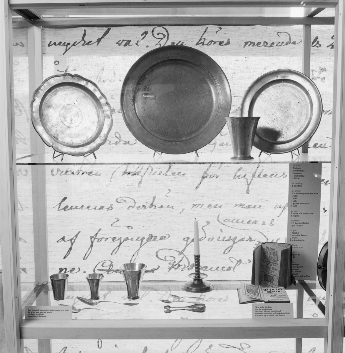 Utställning Tiotusen år. Glasmonter i utställningsdelen Bondesamhället 1800- talet. På översta hyllplanet fat och mugg av tenn på nedre hyllplanet finns det bägare och bestick i silver och ljusstake i mässing. här ligger även en Psalmbok tryckt år 1743.