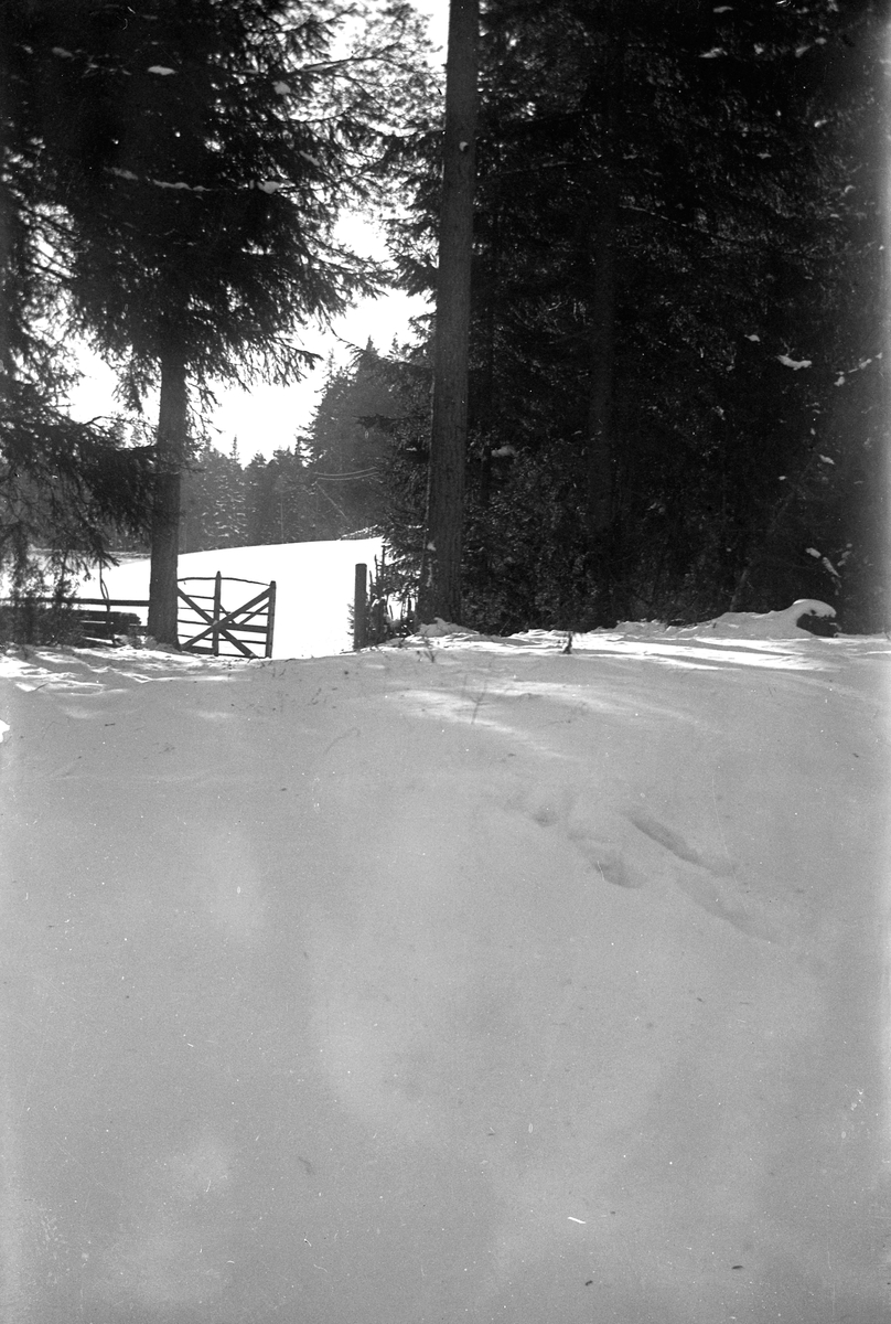 Det är vinter och snö på marken. En grind syns vid ett träd i skogen. Bakom den ett öppet fält.