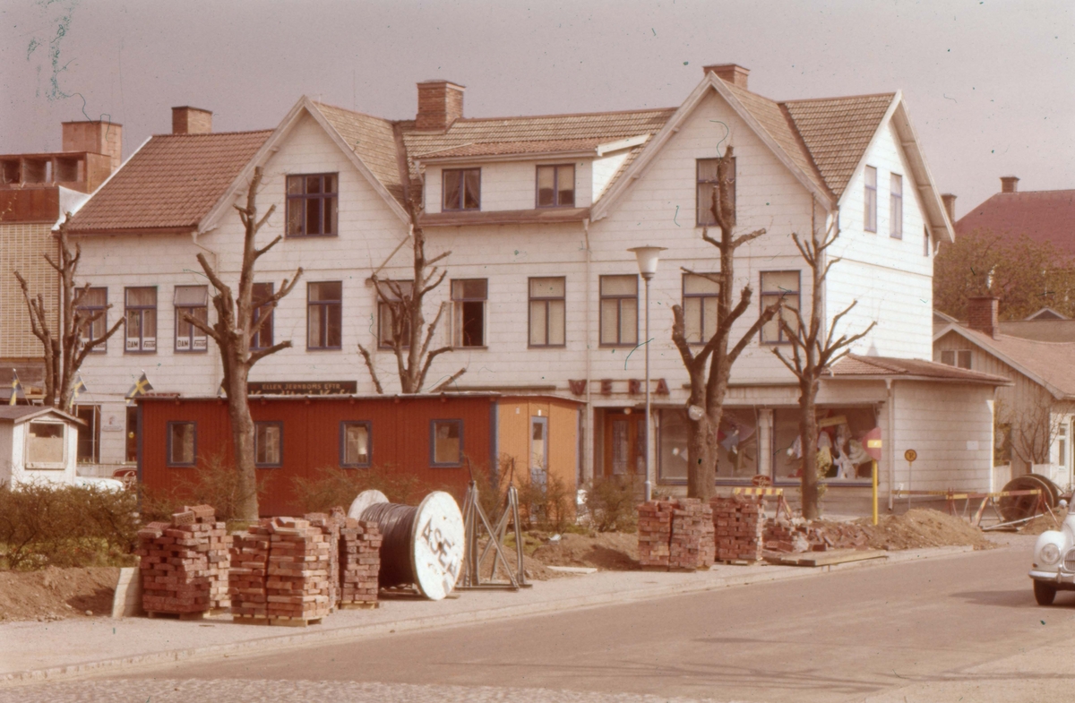 Utmed Kungsgatan i Huskvarna på 1960-talet står ett vitt hus.