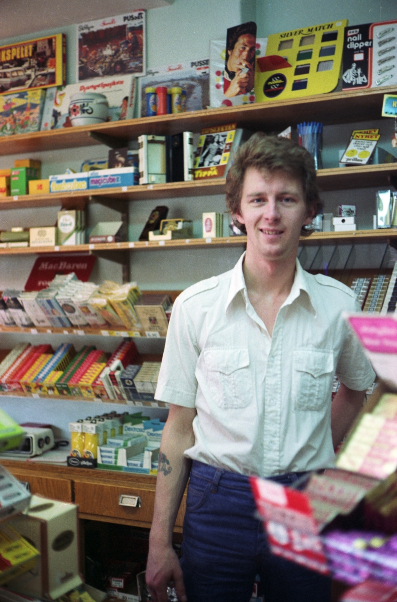 I kiosken i Vättersnäs arbetar en ung expedit. På hyllan bakom honom syns bland annat leksaker, konfektyrer, filmrullar och cigaretter.