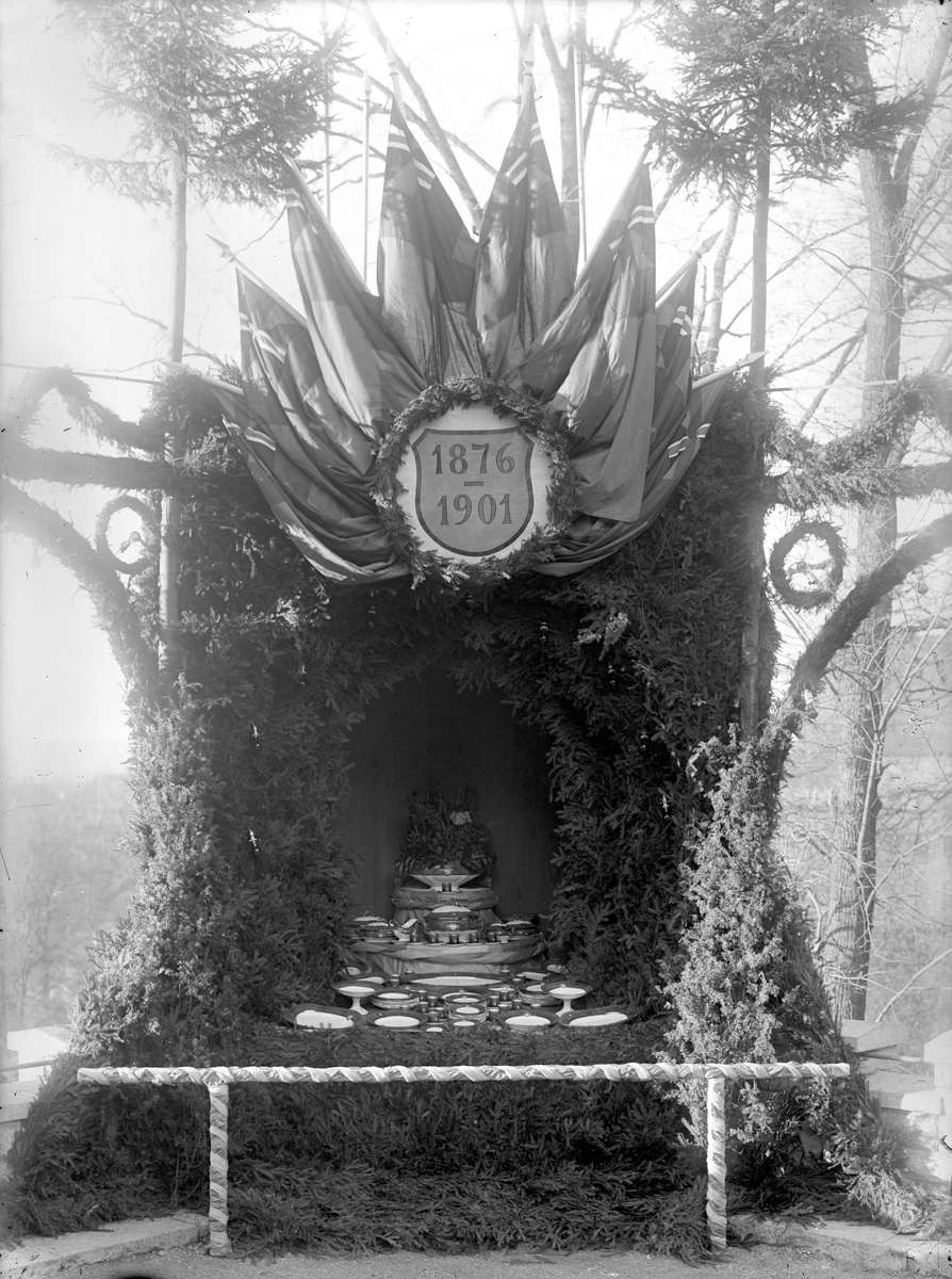 Ett jubileumsarrangemang år 1901 (1876-1901, 35 år. På bilden ses ett arrangemang av gran- och enris där det visas porslin.