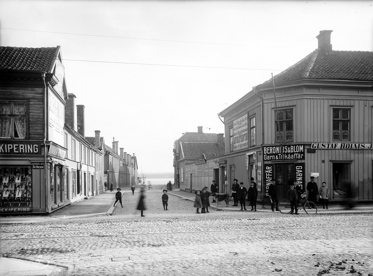 Borgmästargränd söderut från Östra Storgatan i Jönköping. Den tidigare smala gränden har breddats och en halv fastighet har rivits. Ovanför "Beronius & Blom Garn & Trikåaffär" som grundades 1901, låg Gustaf Holms välkända juridiska byrå. I gränden på östra sidan hade hovfotografen Oscar Rylander sin ateljé.
