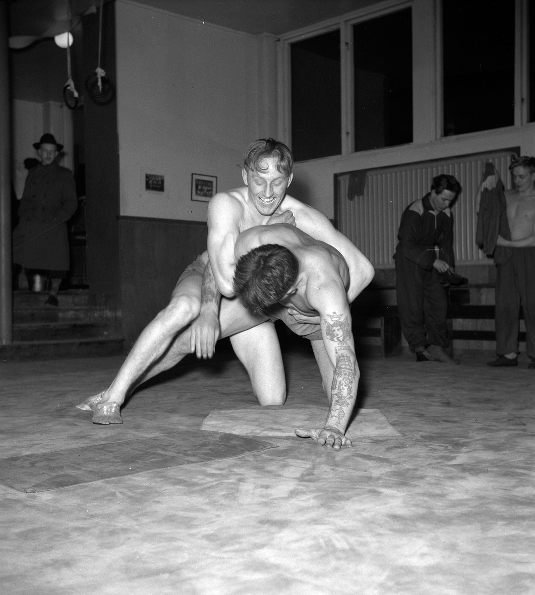 Två brottare från IK Tord i idrottshuset, Jönköping, överst Sigvard "Slaktarn" Johannesson, underst Olle "Abben" Lindberg (identifierad via sina tatueringar). Som åskådare till vänster i trappan står Holger Wern.