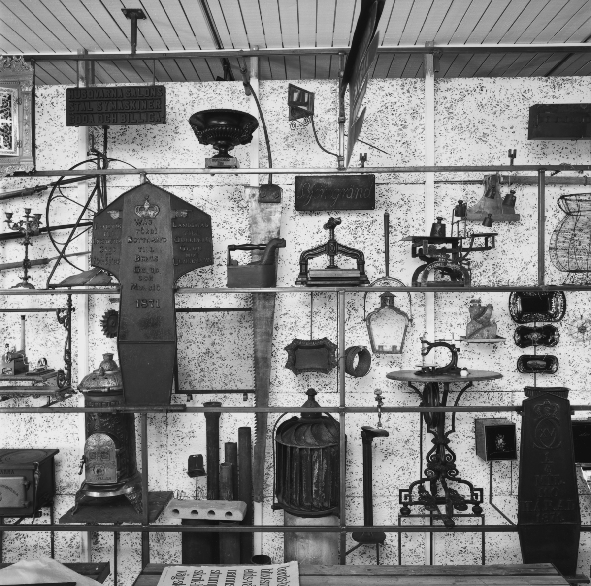 Järnväggen. Milstolpe med text 1/4 Mil mo härad 1871 med Carl xv:s namnchiffer. Gatuskylt från Björngränd i Jönköping. Trädgårdsurna tillverkad av Huqvarna AB. ljusstakar.