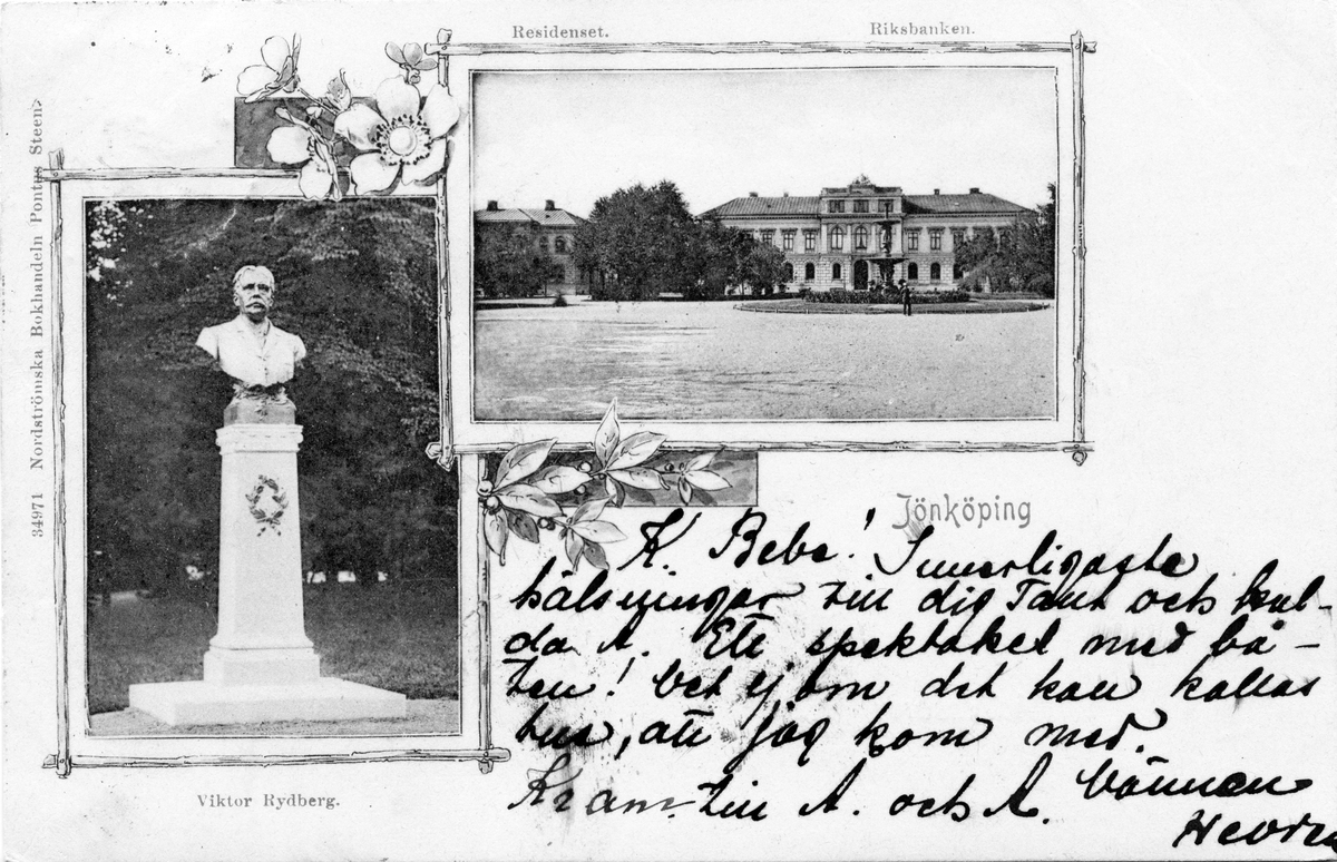 Ett Brefkort med bilder på Viktor Rydberg, Riksbanken och Länsresidenset i Jönköping.