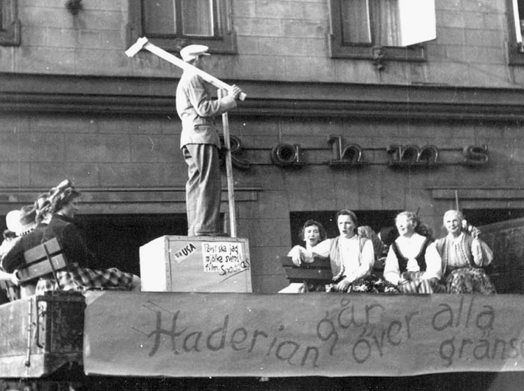 En lastbil passerar Rahms kappaffär på Östra Storgatan i Jönköping. På flaket sitter några kvinnor och sjunger. Där står en låda med texten: "Till USA. Först ska jag mjölka svensk film. Snoddas" och ovanpå lådan står en man med redskap. På flakets sida står texten: "Haderian går över alla gränser".