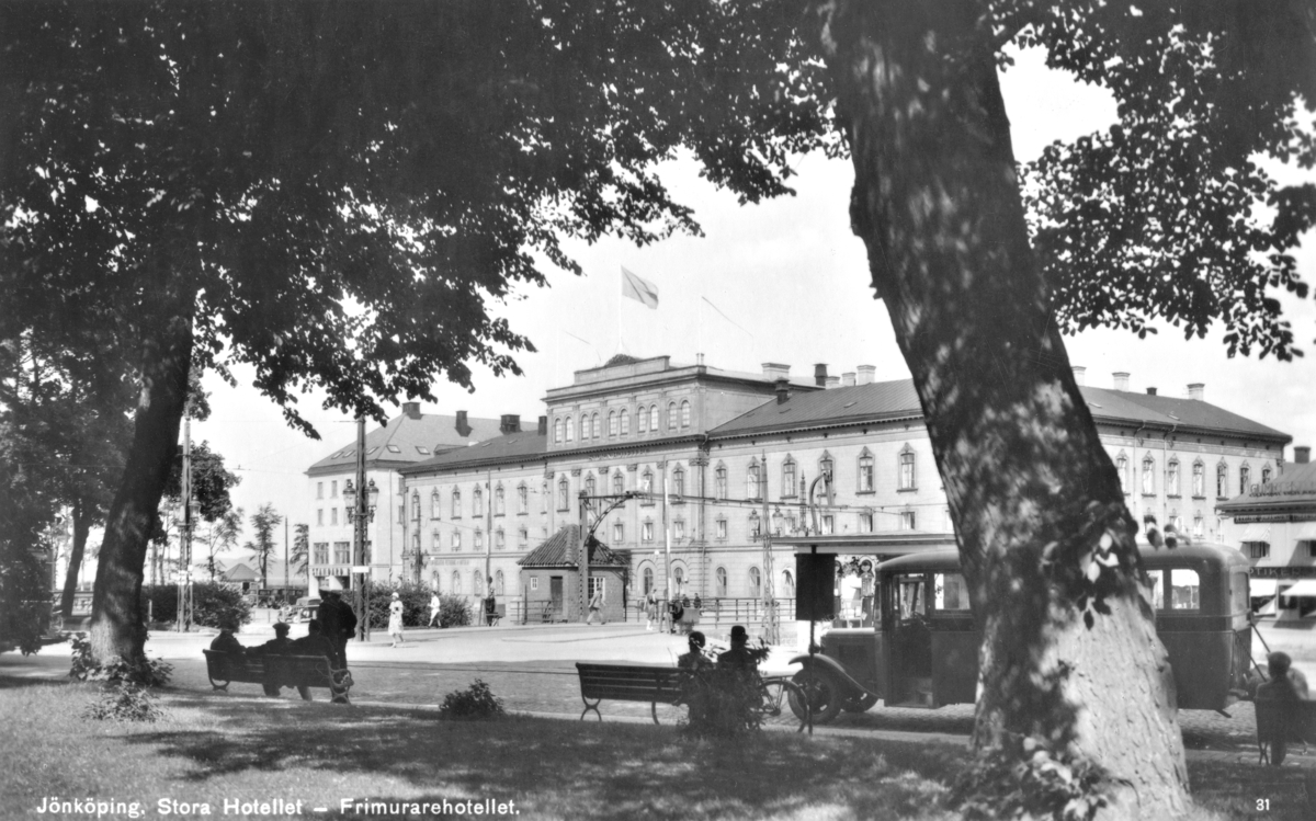 Från busshållplatsen på Hamnplan i Jönköping har man bra utsikt mot Stora hotellet, som öppnades år 1860. Efter att hotellets restaurangdel eldhärjats tillkom den nya hotellbyggnaden mot Norra Strandgatan, med invigning påskafton 1932.