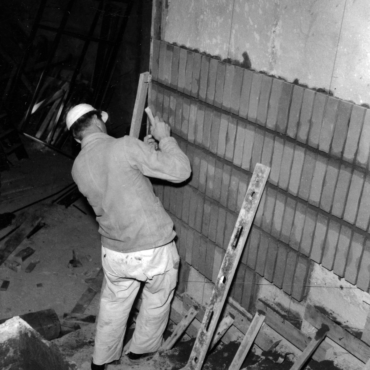 Nya Länsmuseet i Jönköping under uppbyggnad. Stavtegel muras i huvudtrappan.