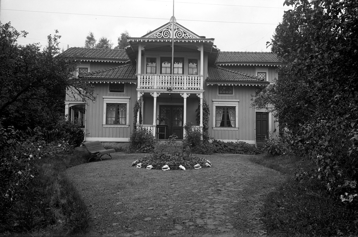 En stor trävilla med snickarglädje på veranda och balkong. På gårdsplanen finns en rund plantering kantad med stora snäckor och en bred grusgång leder genom trädgården.