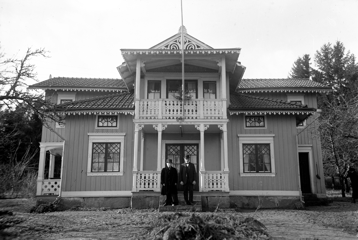 En stor trävilla med snickarglädje på veranda och balkong. På trappan står ett äldre par. Framför huset finns en rund plantering täckt med granris.
