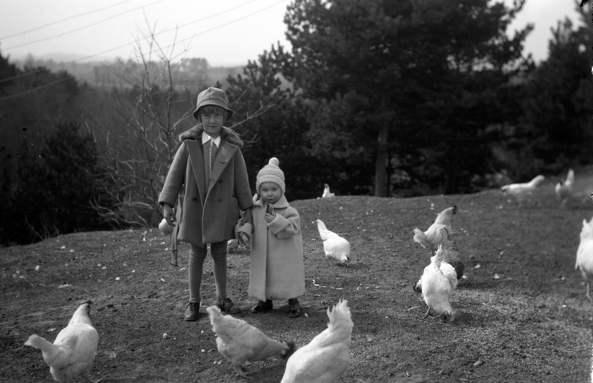 Två barn bland några hönor. Det lilla barnet äter på en brödbit som hon håller i handen.