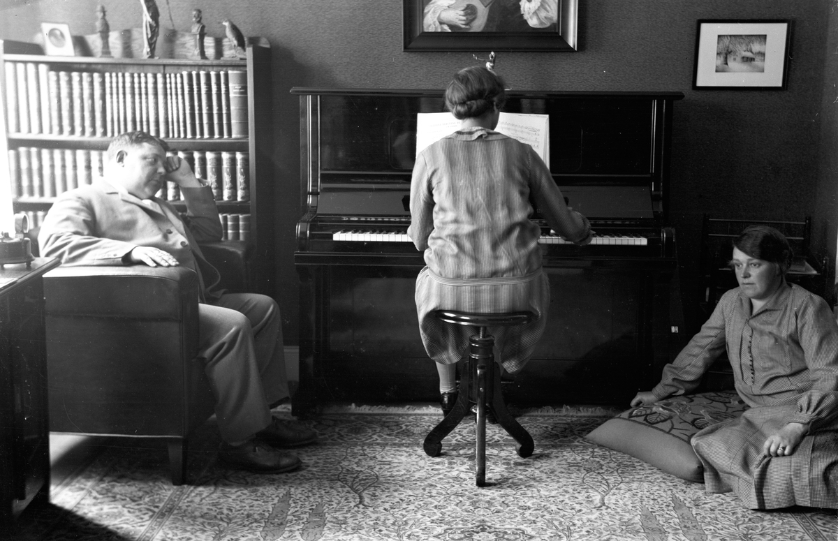 En kvinna sitter vid pianot och spelar. En man i en fåtölj och en kvinna vid en kudde på golvet sitter och lyssnar.