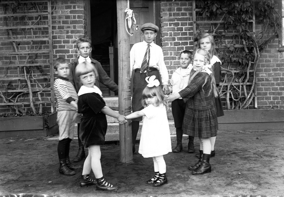 Dans runt flaggstången i samband med 50-årsjubiléet av "Bostädernas" tillkomst år 1873 i Jönköping. Från vänster: Hans Börjesson, John Börjesson, Gösta Johansson, Ulla Svensson, Arne Börjesson, Fritz gustavsson, Britta-Stina gustavsson och Britt Johansson.