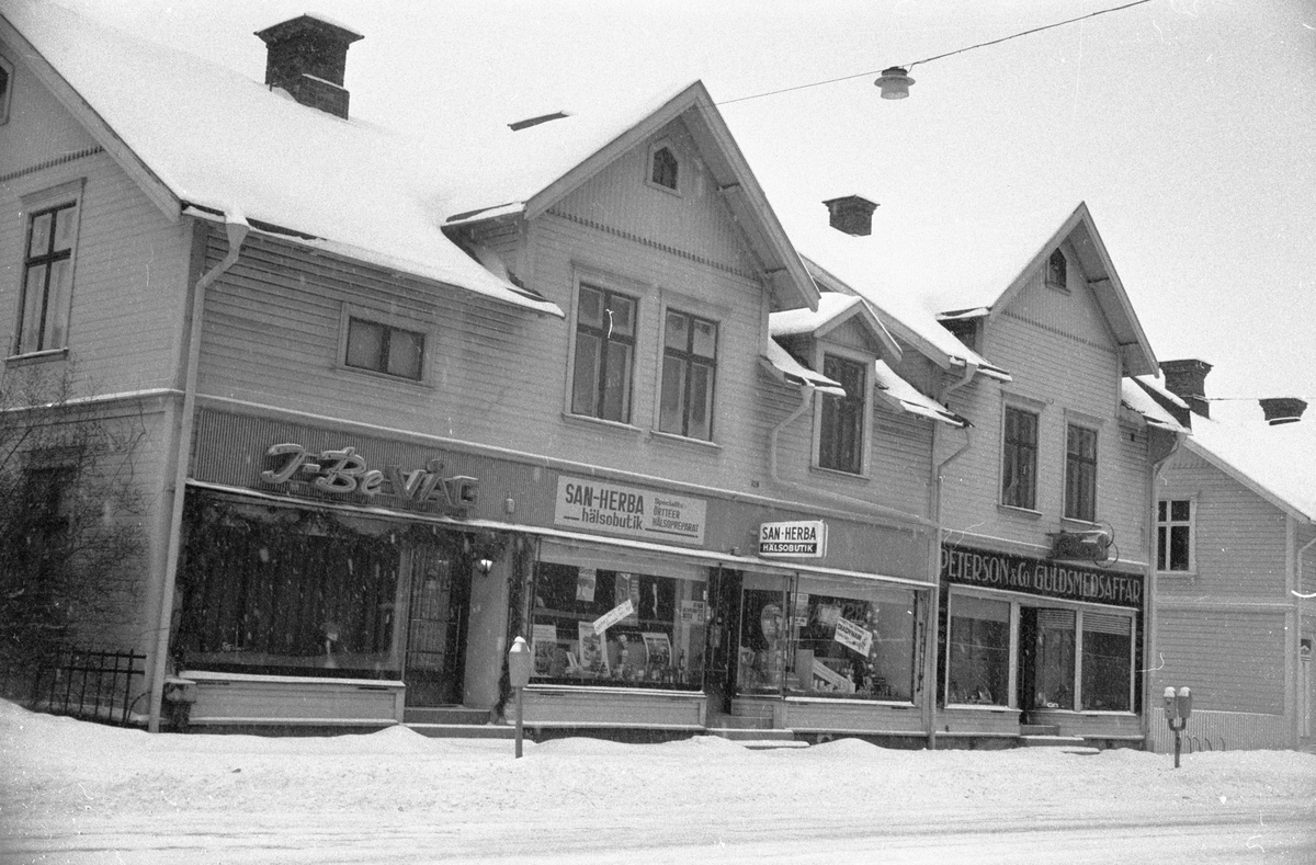 Frisörsalongen J-Be våg, Hälsobutiken San-Herba och Peterson & Co Guldsmedsaffär finns i ett hus på Rosenborgsgatan i Huskvarna.