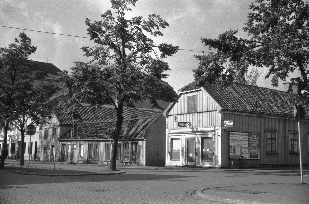 Trähus med en Frisörsalong i hörnet Kanalgatan - Björngränd i Jönköping. En cykel står lutad mot en skylt för affischering, som bland annat gör reklam för bilmärket Wolksvagen.