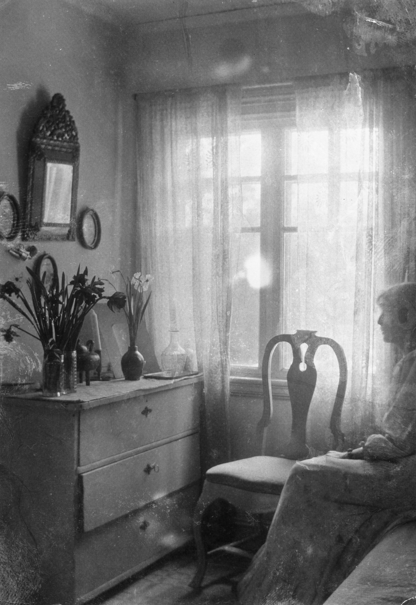 Ester Bauer sitter på sängen i blå rummet i stugan de hyrde i Torstorp utanför Gränna. Vaser med påsk- och pingsliljor står på en byrå mittemot henne.