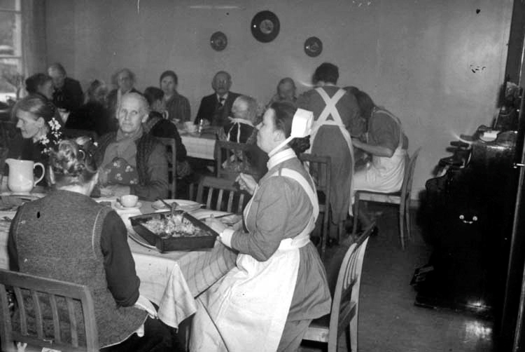 Troligen från matsalen på ett ålderdomshem där de boende och personalen har samlats för en gemensam måltid.