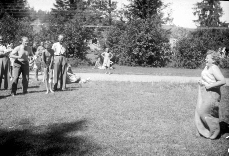 Vuxna och barn har samlats för gemensamma aktiviteter och på gräsmattan tävlar man i säcklöpning.