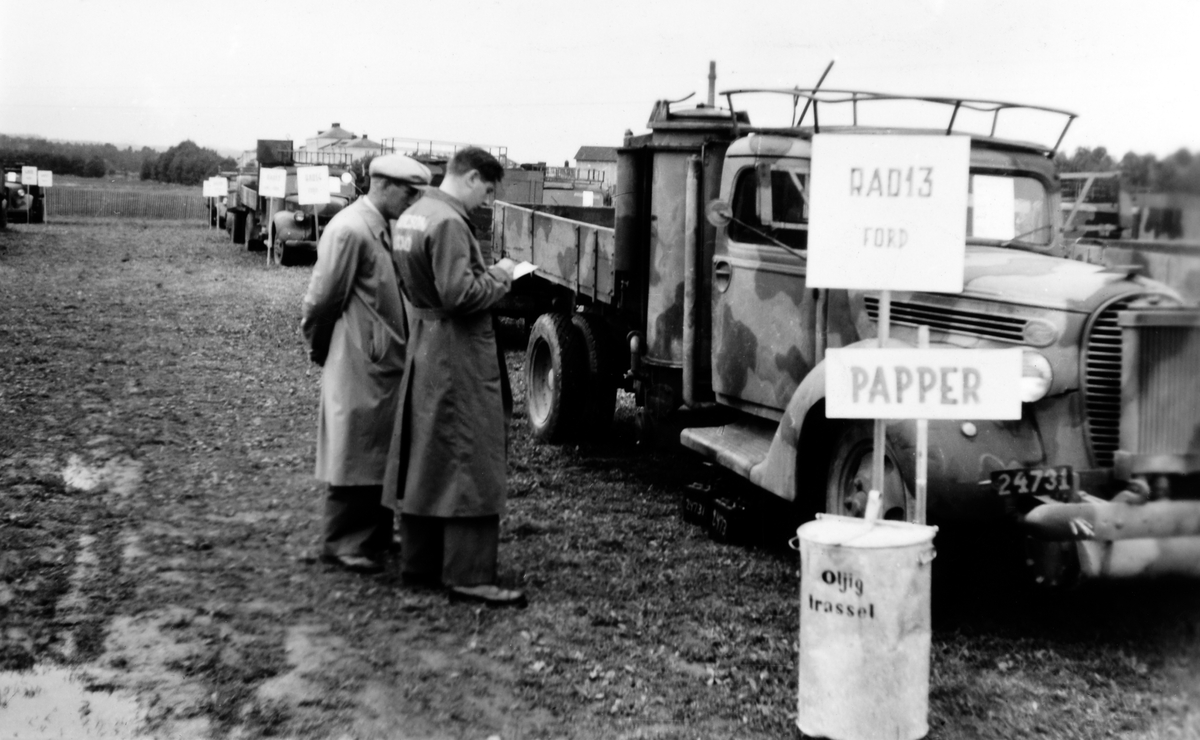 Militärfordon är uppställda i rader och kontrolleras av två män.