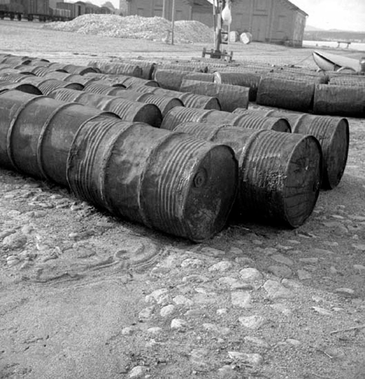 Ett antal oljefat ligger på en kullerstensplan i Jönköping. Till vänster mellan förrådsbyggnaderna står ett antal godsvagnar på järnvägsspåret.