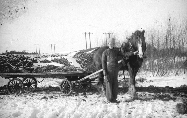Hästkörsla en vinterdag med en ardennerhäst med loksele.