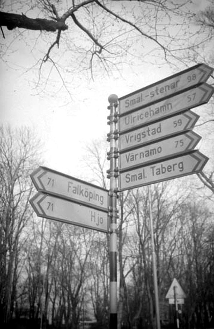 I korsning Västra Storgatan - Kyrkogatan i Jönköping står en vägskylt med avståndsangivelser till Smålandsstenar, Ulricehamn, Vrigstad, Värnamo, Smålands Taberg, Falköping och Hjo.