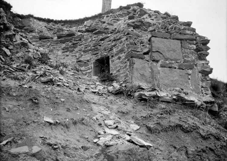 Näs borgruin på Visingsö. Västra tornet med dörröppningen mot öster, ett bomhål till vänster vid den övre flata hällen. Bilden är tagen från sydväst.