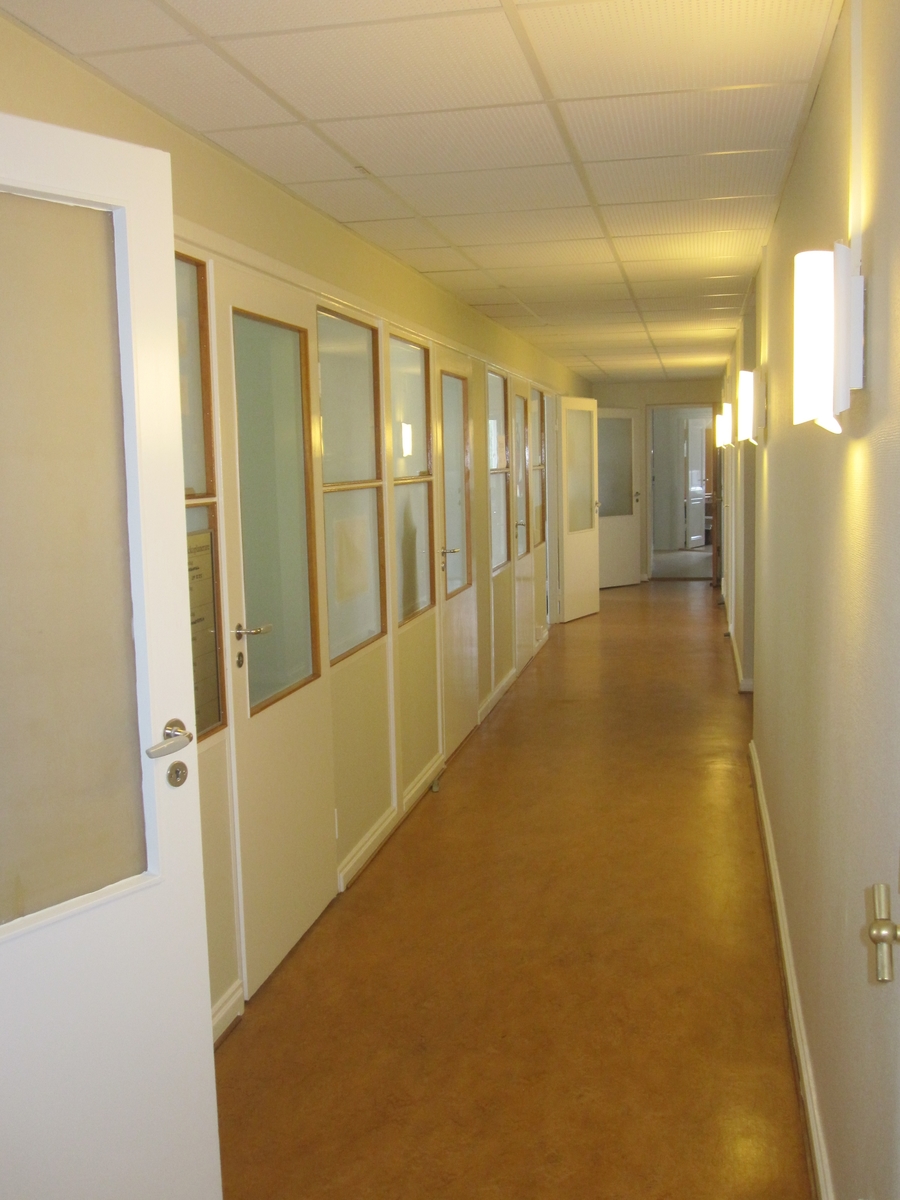 Interiör från Tranås stadshus i Tranås stad och kommun. Bilden visar en korridor med glasad trävägg som avskärmning.