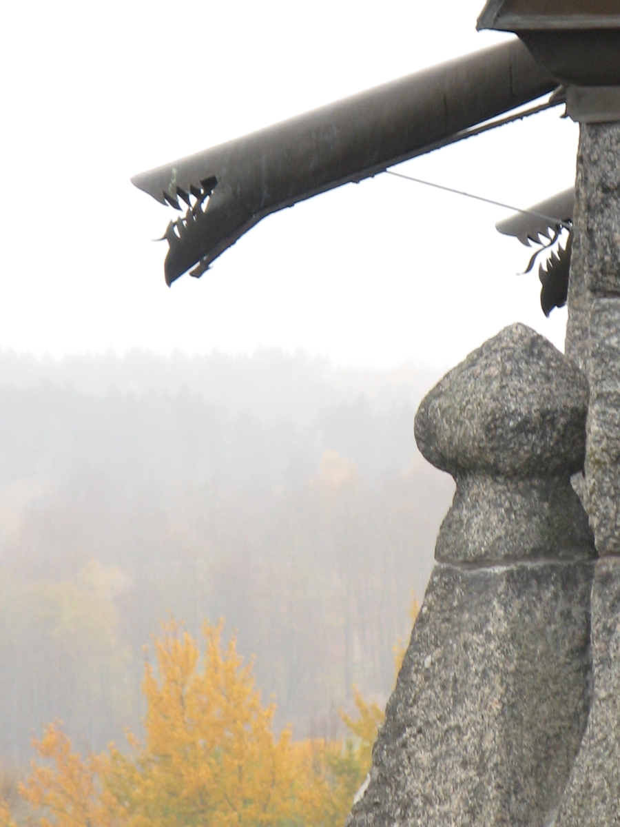 Exteriör, Vallsjö nya kyrka i Sävsjö kommun. Drakformade utkastare på tornet.