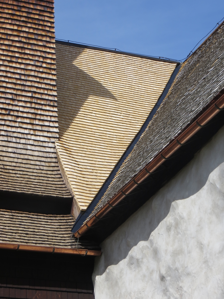 Detaljbild, nyrenoverat tak på Nydala kyrka i Nydala socken, Värnamo kommun.