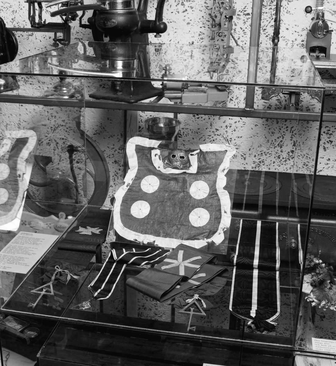 Utställning Tiotusen år. Utställningsdelen Tågvagnarna i glasmonter 4:2 ligger insigner från frimurarorden.