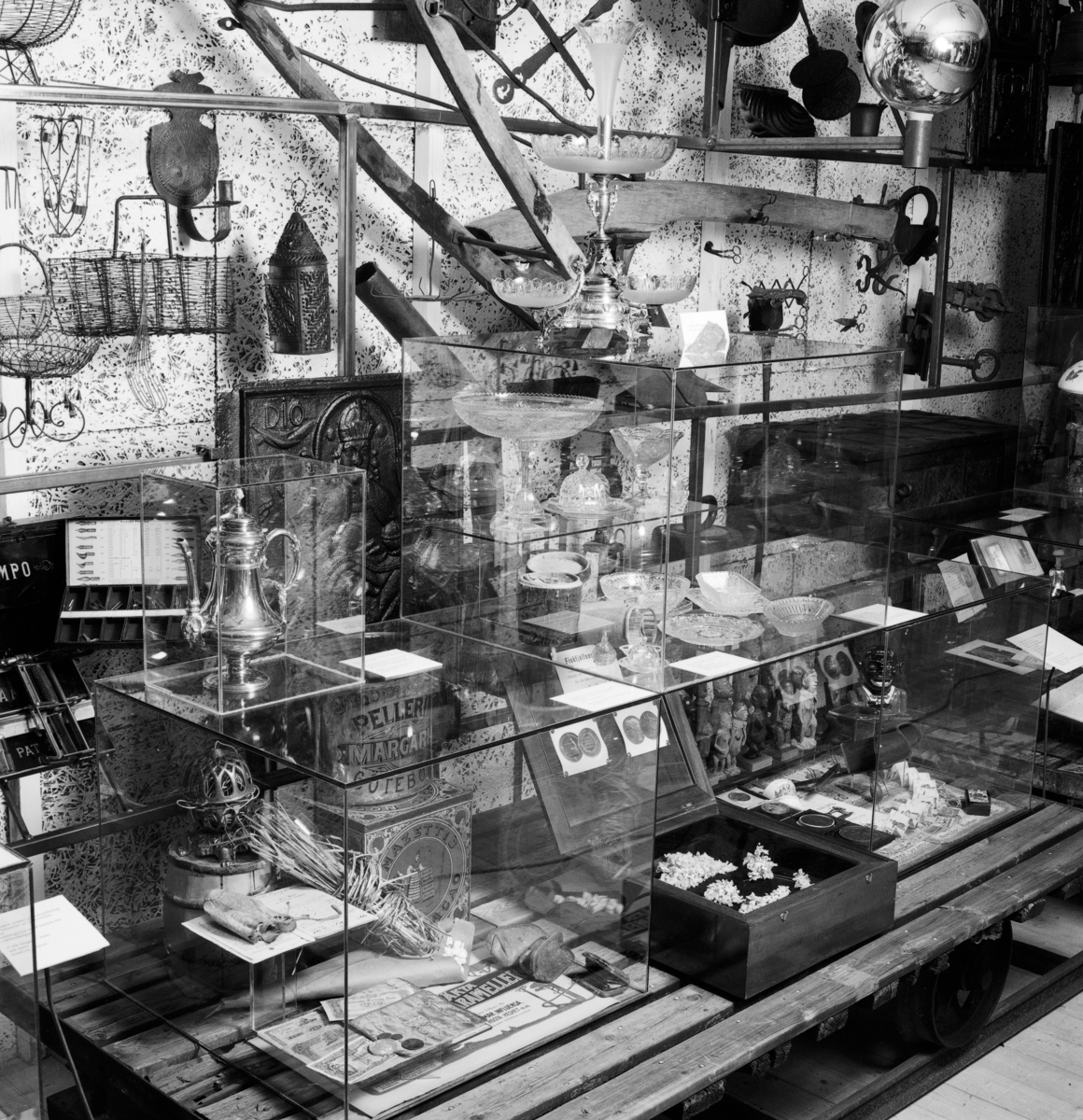 Titel: Utställning Tiotusen år. Utställningsdelen "Tågvagnarna" en överblick över glasmontrar 2:1 med statyer från Kongo och glasmonter 2:2 med industripressat glas och monter 2:5 med plåtburk Pellerins margarin.