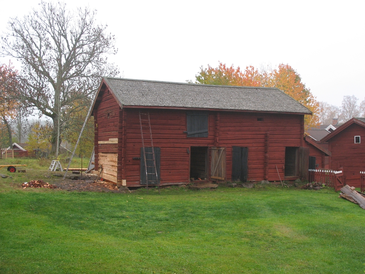 Exteriör, byggnad 25 (stall, fårhus) på Näs 1:8 i Ingatorp, Eksjö kommun. Byggnaden genomgick under fototillfället syllbyte och timmerlagning.