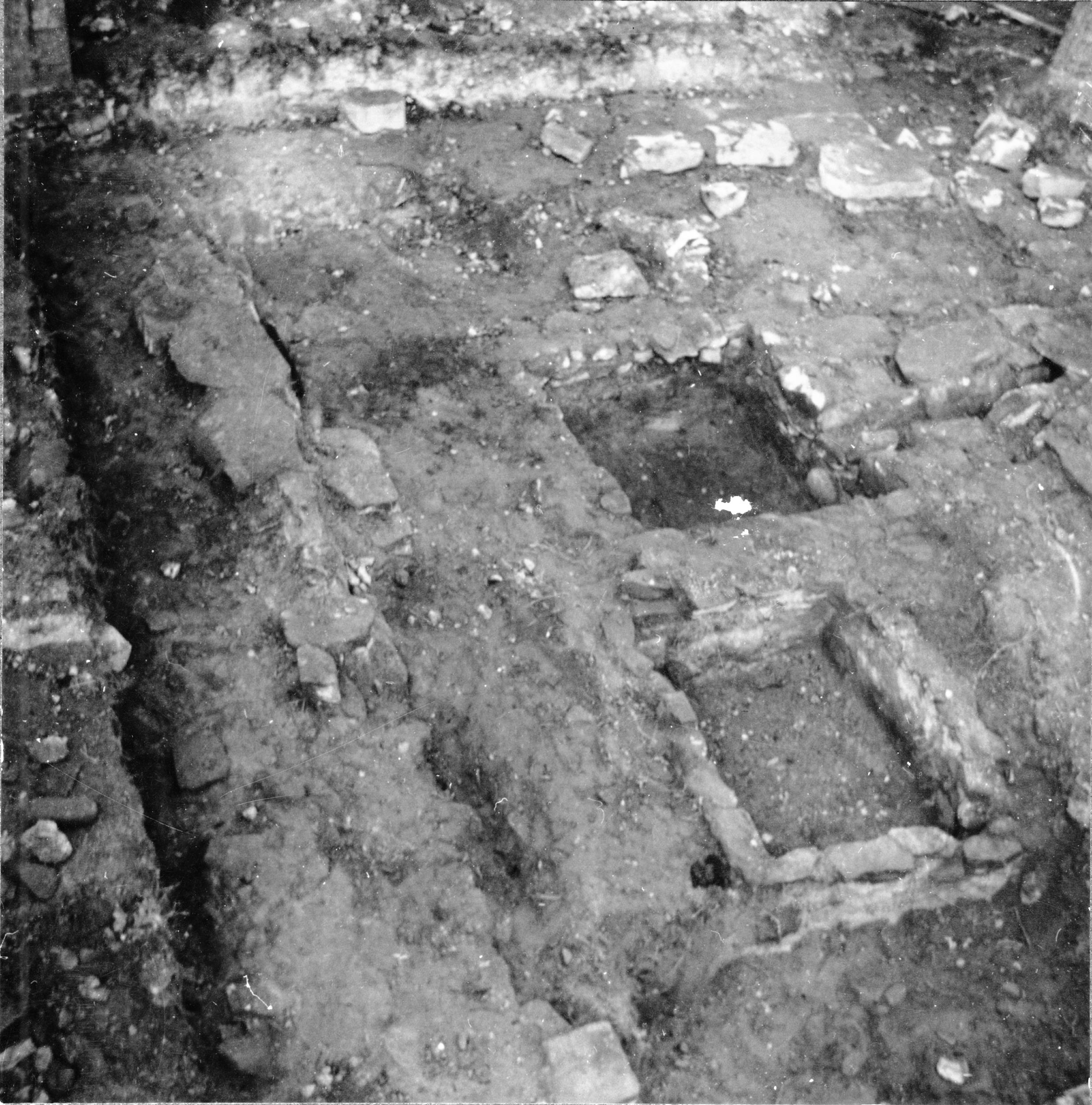 Beskrivning: Kyrkoruinen, romanska gravar i koret.