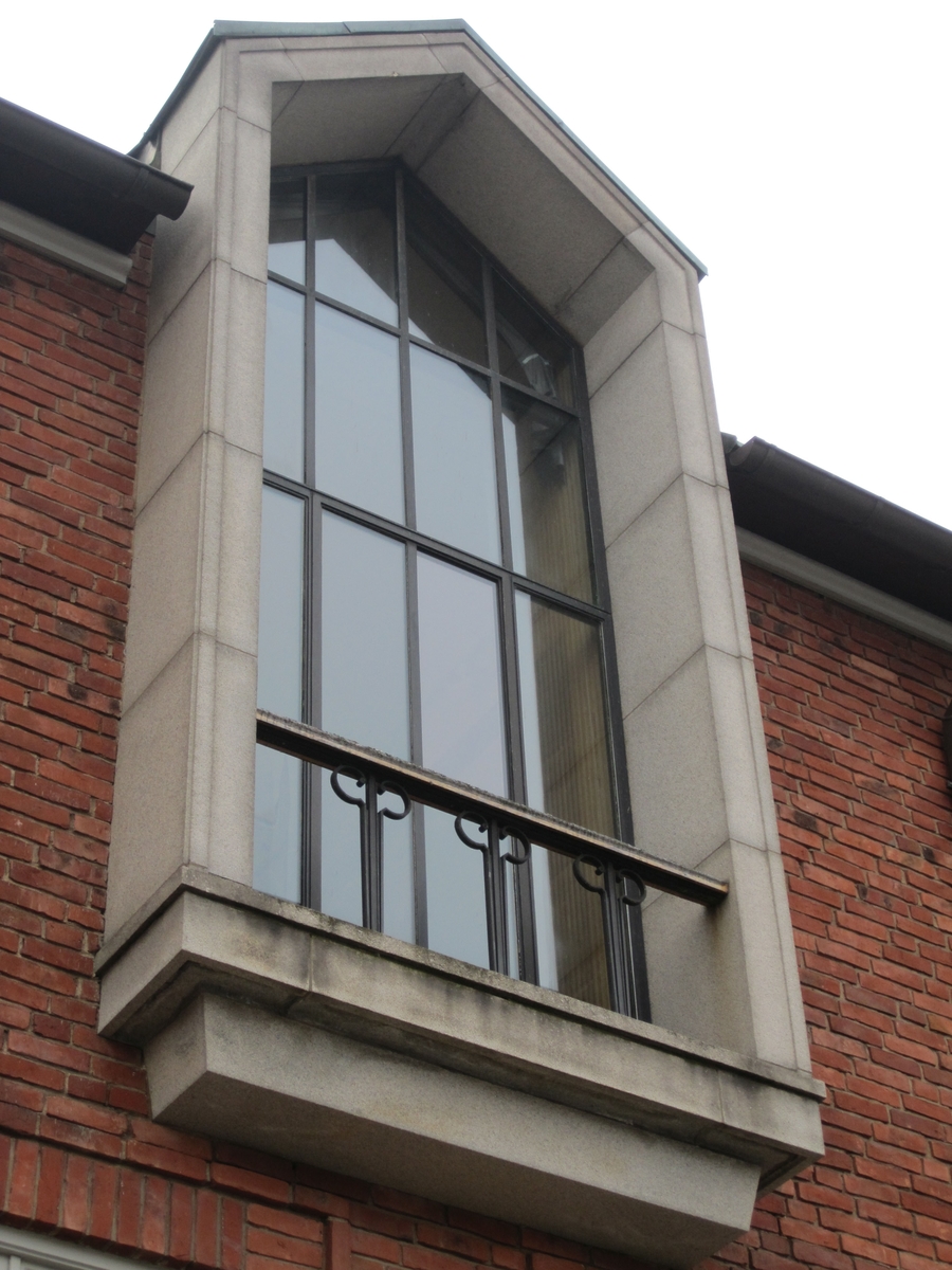 Exteriör, Tranås stadshus i Tranås stad och kommun. Bilden visar ett fönsterparti för kommunfullmäktiges sessionssal.
