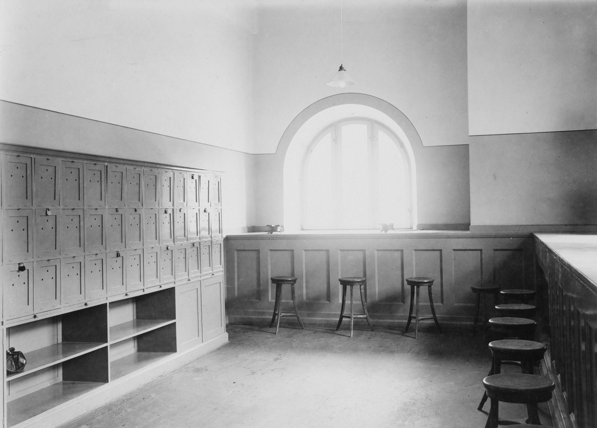 Jönköpings högre allmänna läroverk. Utmed väggen finns ett stort antal låsbara skåp med hyllor under. Framför långa bänkar står höga trebenta träpallar.