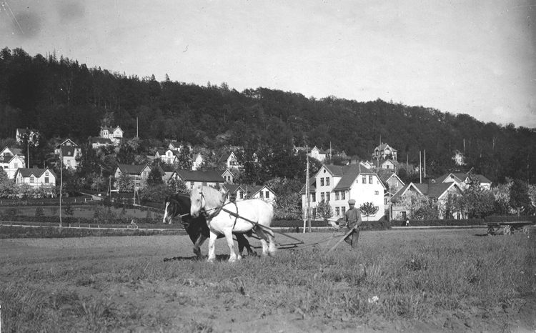 Efter två hästar går en man och plöjer en åker i Huskvarna.