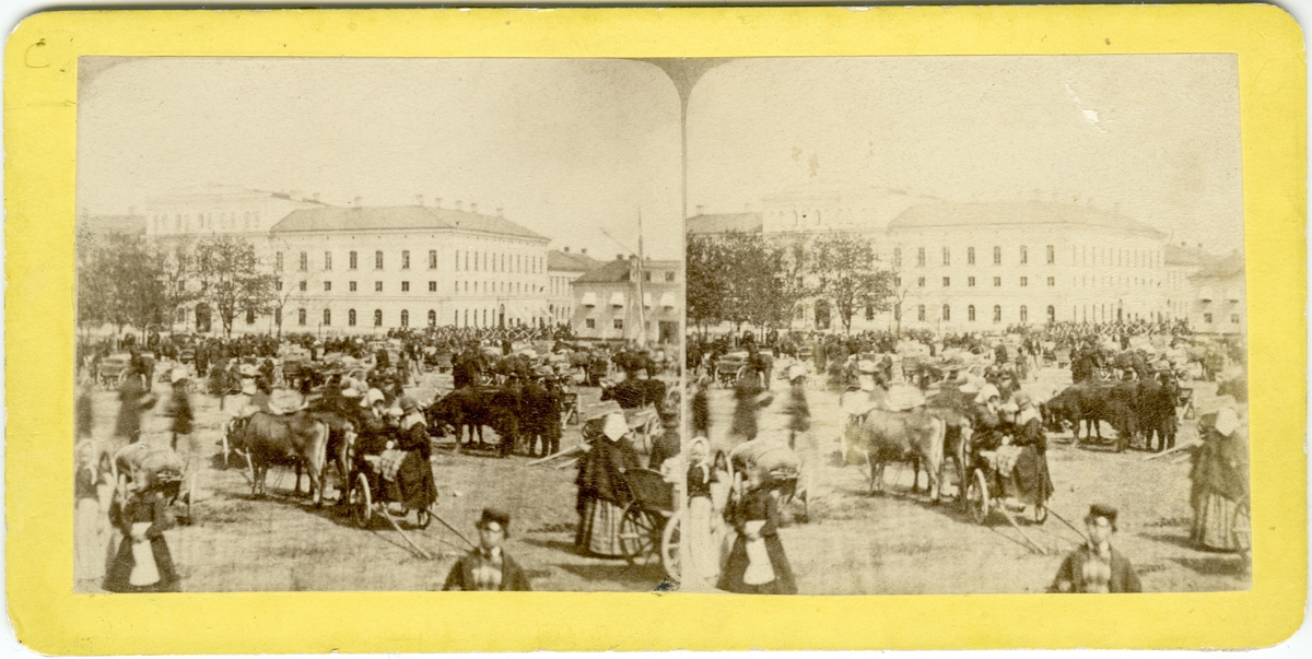 Vy över Svintorget (nuvarande Rådhusparken) i Jönköping en kreatursmarknadsdag.