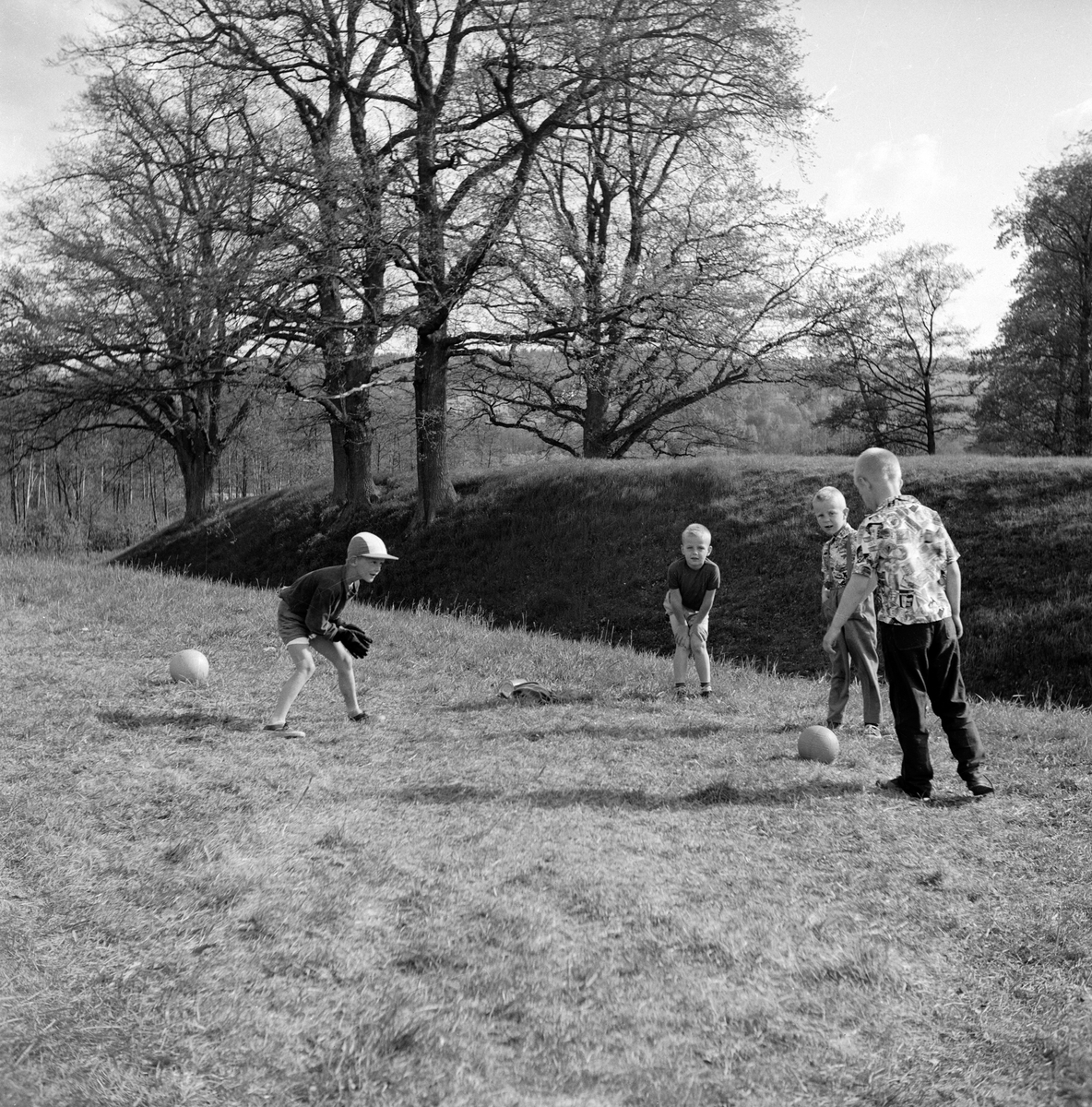 Vid Rumlaborg i Huskvarna spelar några pojkar fotboll. Från vänster: Per Andersson (2), Kent Pettersson (3), Tom Andersson (4).