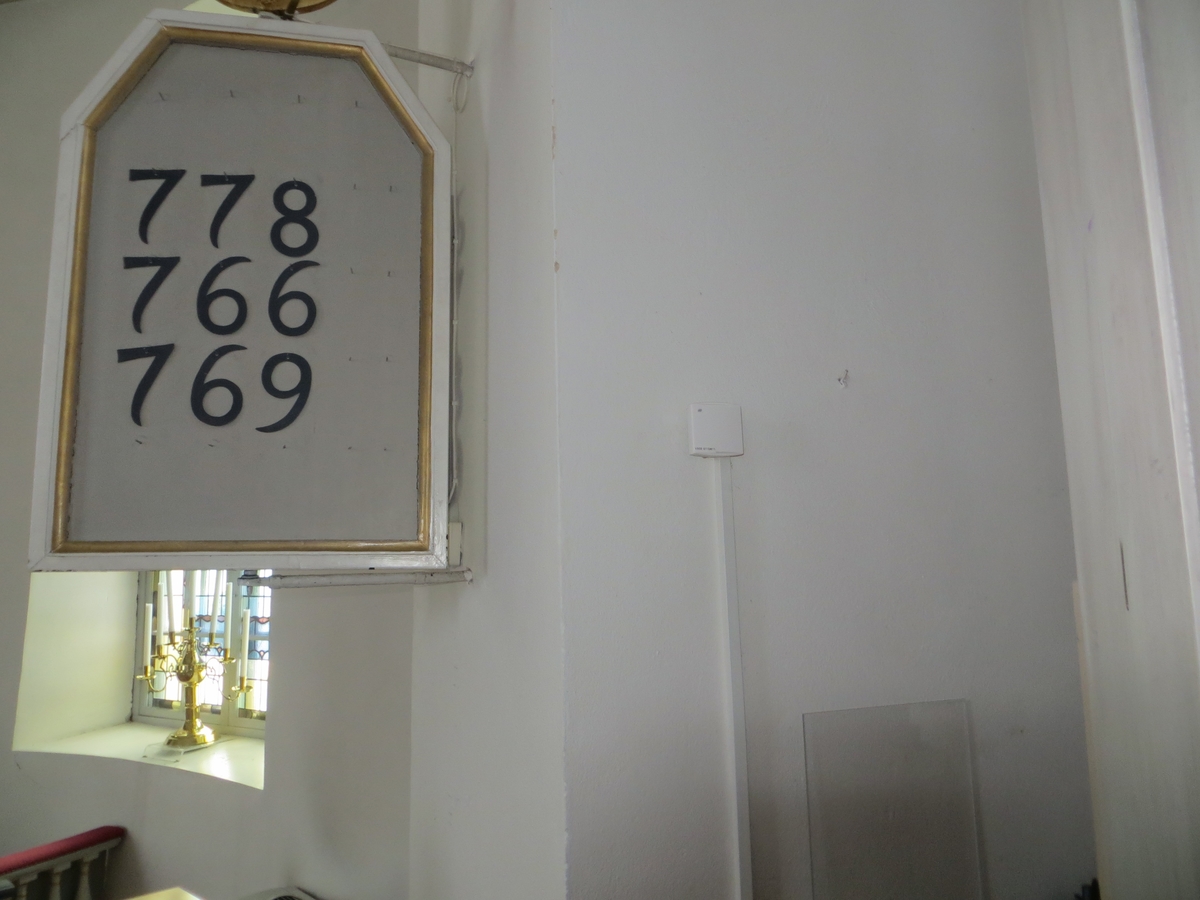 Interiör från Villstad kyrka med nyinstallerad givare för klimatmätning.