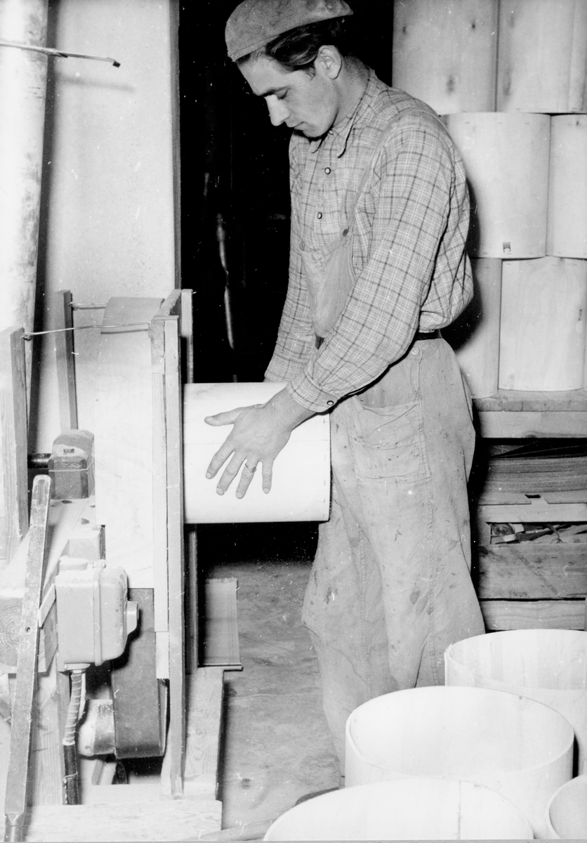 Habo Laggkärlsfabrik. Putsning av plywoodtunnor av Ingvar Bratt.