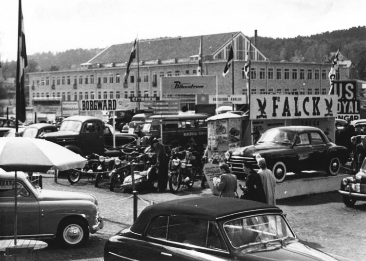Riksmässan i Jönköping. Bilar är uppställda brevid reklamskyltarna. I bakgrunden syns Praktiska skolan.