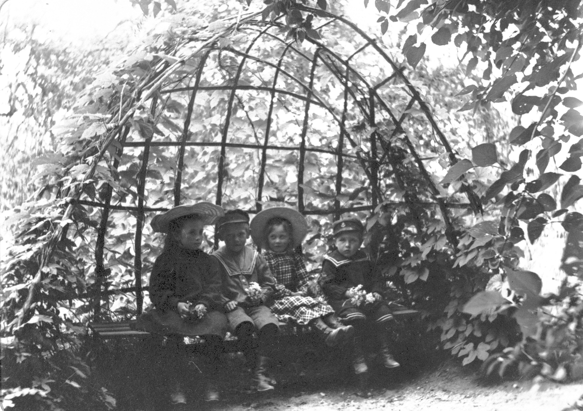 I en lövkoja utanför Hertha Björlingsons barndomshem i Tångerda, sitter sonen Sten (nr 2 från vänster) och några jämnåriga barn.