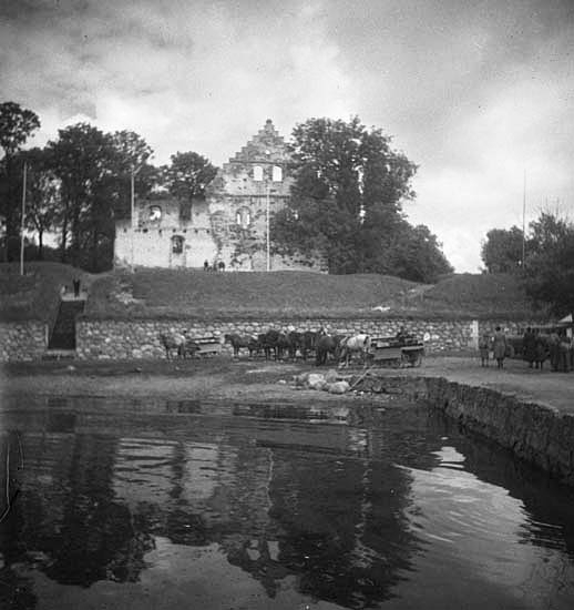 Visingsborgs slottsruin på Visingsö. I förgrunden vid gamla hamnen står remmalagen och väntar på att få guida besökare på ön, med häst och specialbyggd vagn.