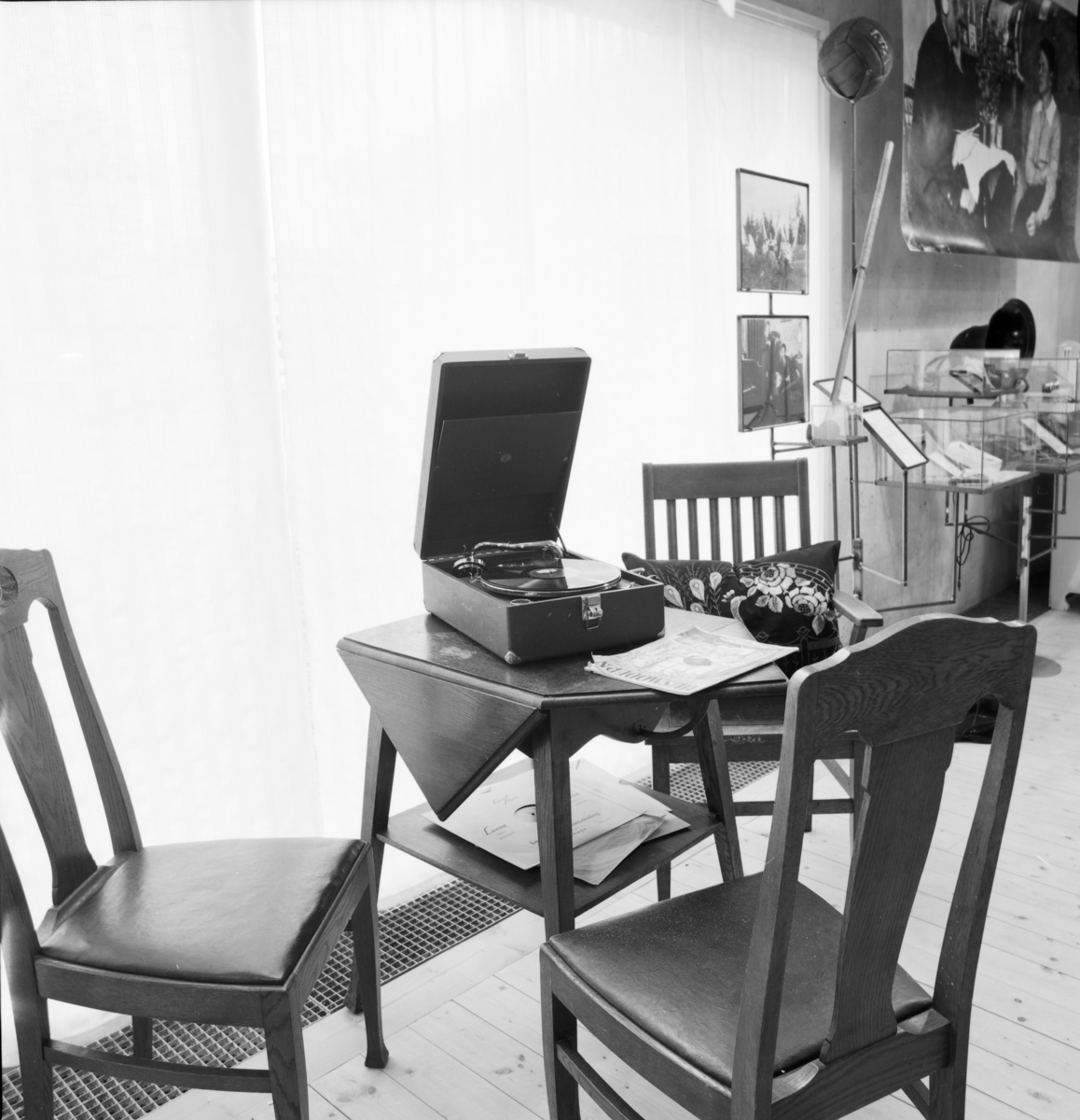 Utställning Tiotusen år. Bord med tre stolar på bordet står det en grammofon.
