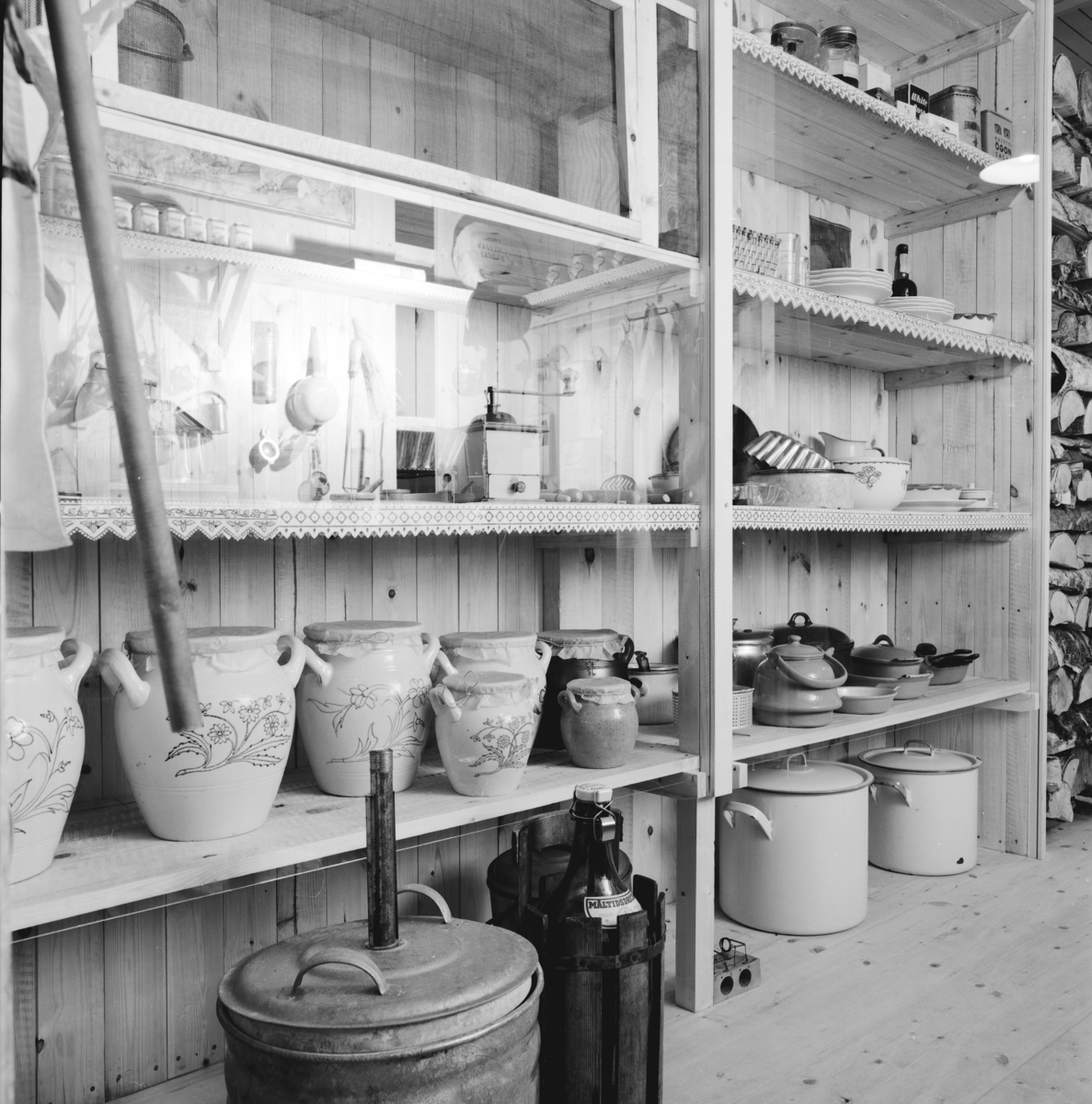 Utställning Tiotusen år. Utställningsdelen skafferiet med olika föremål för köket. På nedre hyllan olika krus, olika grytor, formar och kaffekannor.