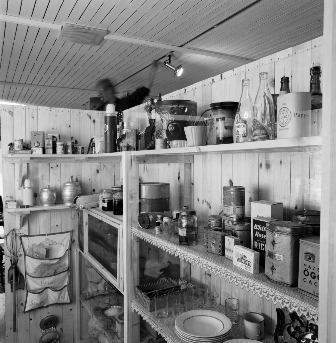 Utställning Tiotusen år. Utställningsdelen skafferiet med hyllor fyllda av det som ingick i ett skafferi för i tiden. På översta hyllan står ljusstakar, vaser,kaffekvarn med mera.
