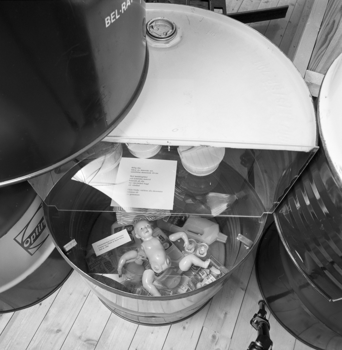 Utställning Tiotusen år. Utställningsdelen tunnor med föremål, docka i celluid.