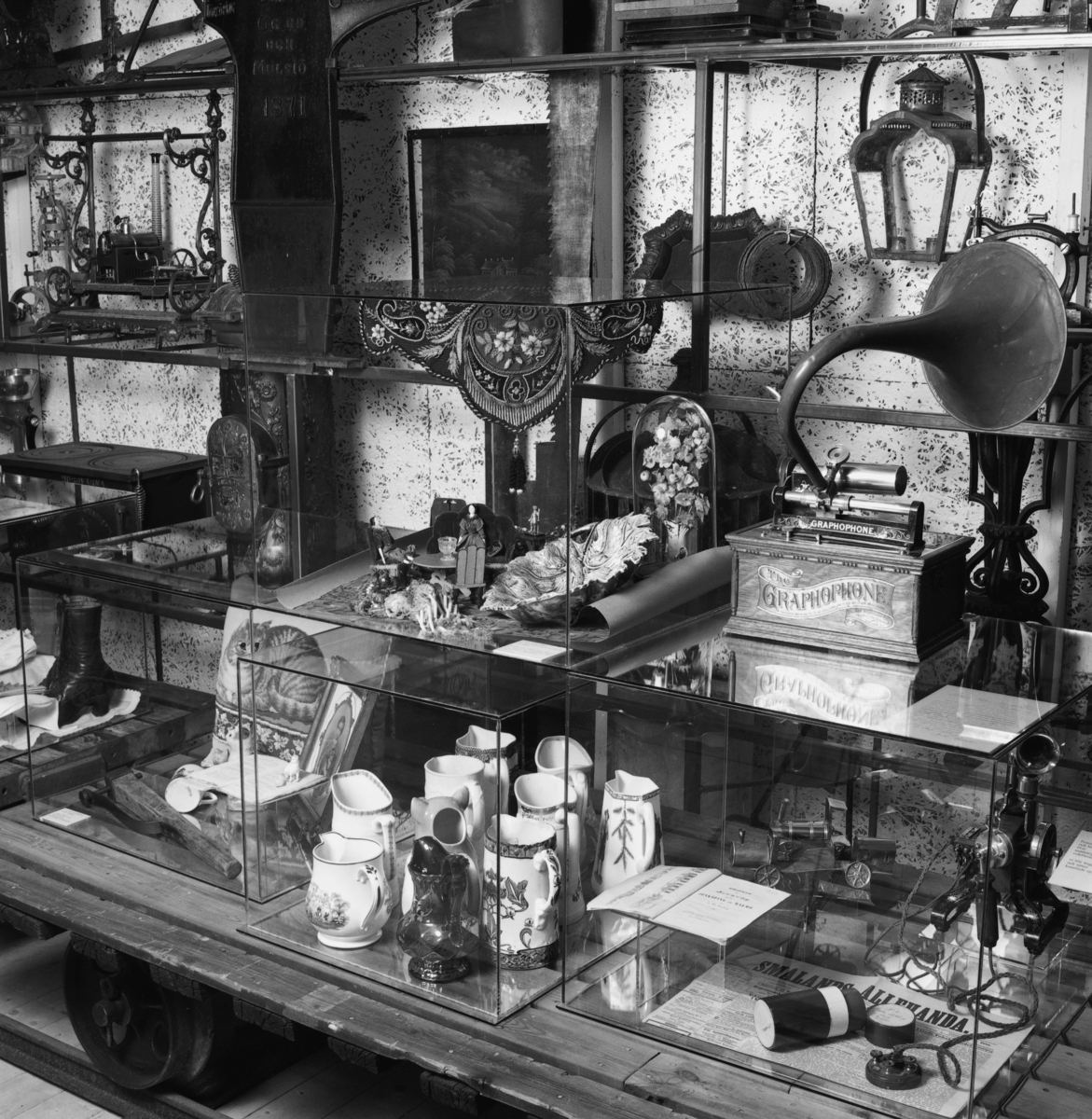 Utställning Tiotusen år. Utställningsdelen Tågvagnarna, översikt över glasmontrarna 3:1, 3:2, 3:3, 3:4.